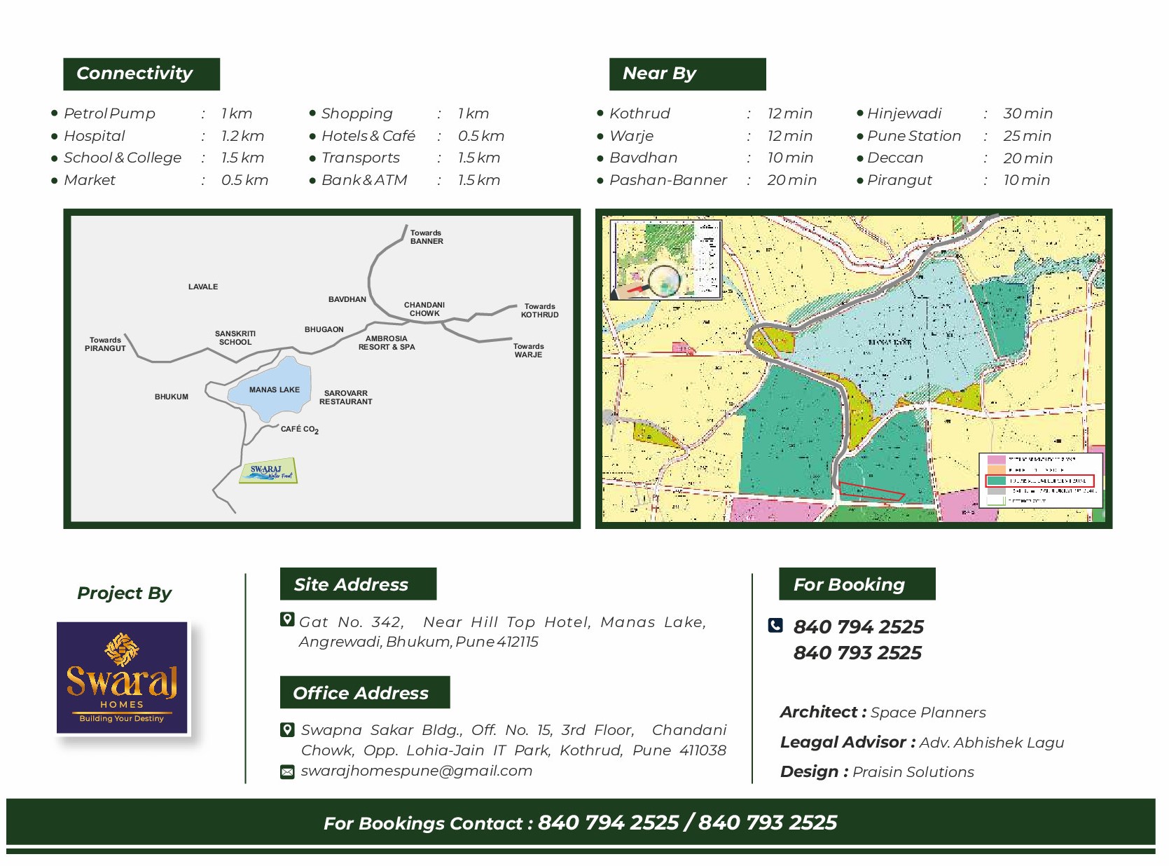 Pune has been the city of independent bungalows & houses, its par t of cultural, we offer you something special offer to choose 2, 3, & 4 BHK bungalows. Bhukum is a next Kothrud in coming future, well connected to the main city of pune, just 10 minutes drive from Chandani chowk, next to manas lake, enjoy great connectivity. At this time when the city is taking shape, , swaraj homes has a master planned & rightly launched its Bunglow project with all the basic necessities & facilities.